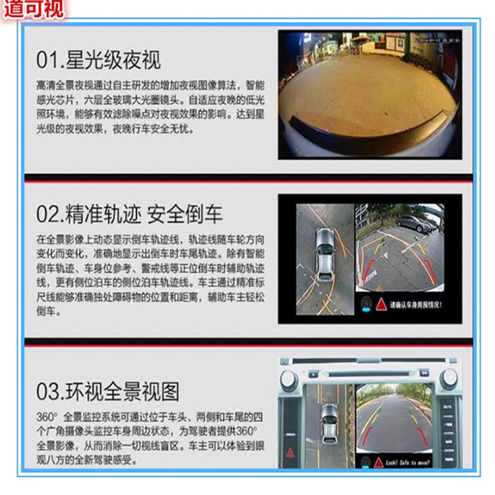 道可視1080P超清版360度全景行車輔助系統(tǒng)擁有更高的清晰度;軌跡線誤差小于5厘米;6大行車輔助功能,讓你行車更安全。我想大家不愿意遇到的就是當(dāng)有些強(qiáng)行變道剮蹭到自己愛車后逃之夭夭,原本以為行車記錄儀可以拍攝到車牌號(hào)碼,結(jié)果取證時(shí)卻發(fā)現(xiàn)只剩一片模糊...分辨率低、夜晚拍攝能力差,取景角度太小這些問題一直都是不正規(guī)行車記錄儀為常見的問題,貪一時(shí)便宜有時(shí)候損失可是相當(dāng)大的。