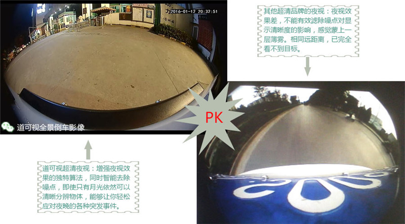 供證據(jù),行車記錄等于白裝了。而道可視360度全景擁有四路超清攝像頭,每個攝像頭都擴大了通光的光圈,在夜晚能夠捕獲更清晰圖像。在微弱星光下,利用增
