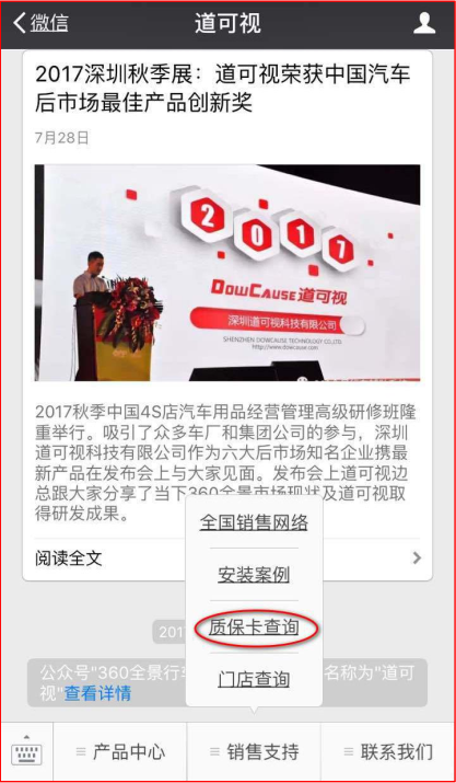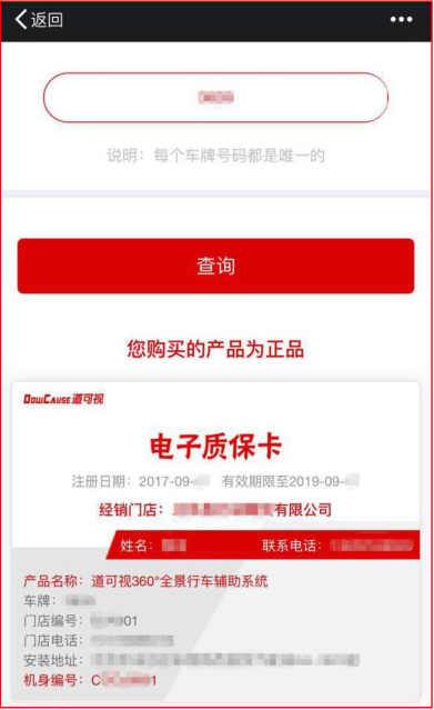 1、查詢產(chǎn)品真?zhèn)?/span>:通過(guò)電子質(zhì)保系統(tǒng)可以查詢到自己安裝的是否是道可視正品360全景,杜絕仿冒產(chǎn)品。