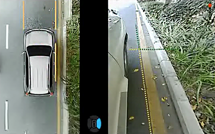 針對(duì)這一場(chǎng)景,道可視的“??柯费履J健痹诘管嚈n模式下開啟雙閃時(shí),會(huì)將車身兩側(cè)(整個(gè)車身、前后輪、踏板等)同時(shí)顯示,以這種近場(chǎng)垂直的鳥瞰圖顯示方式,配合安全參考線(與車身距離為20CM),有效的解決了??柯费聲r(shí)可能對(duì)輪胎及輪轂造成刮傷的問(wèn)題。